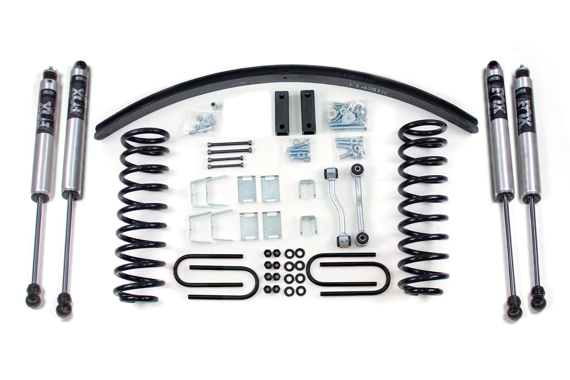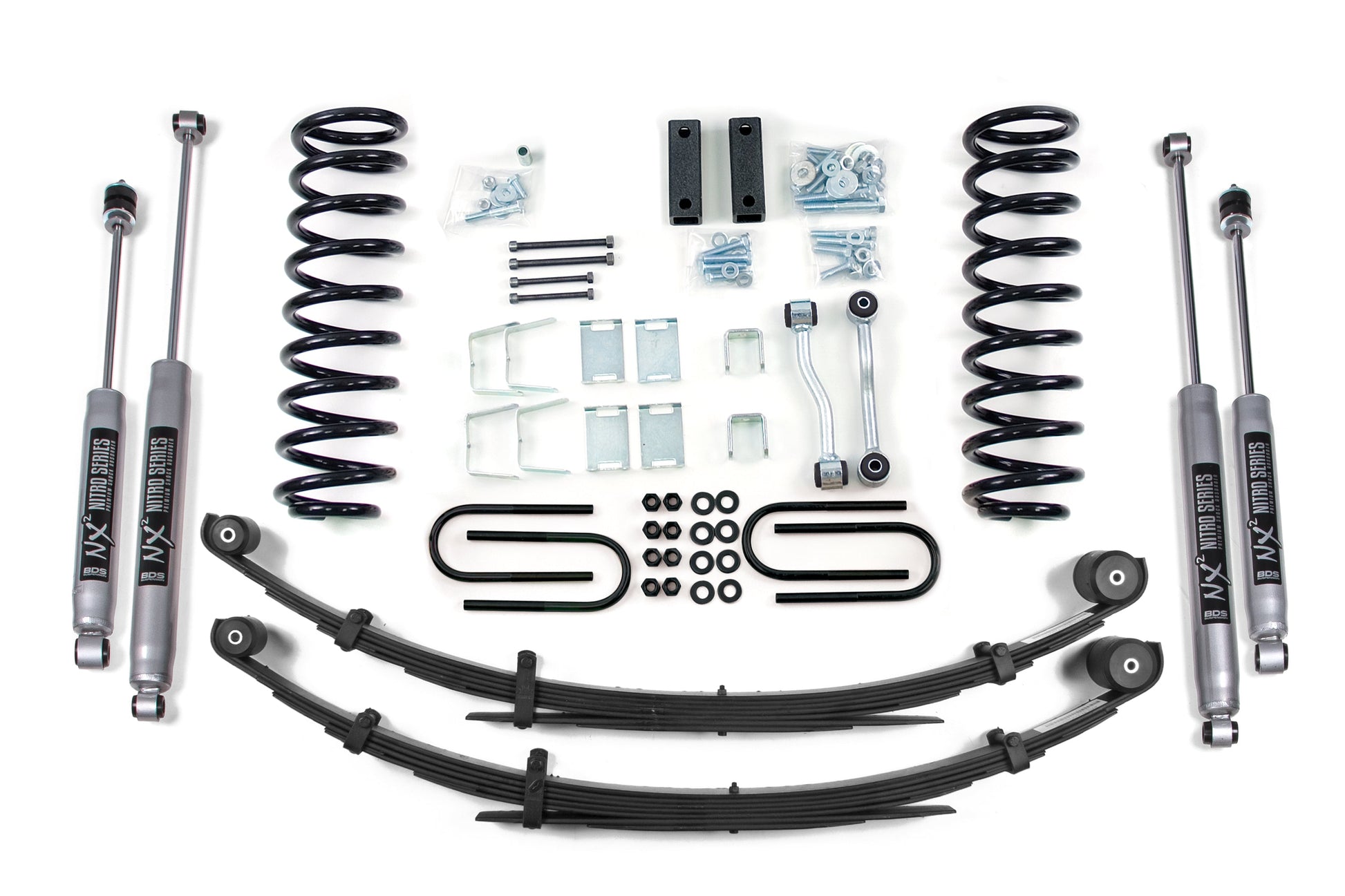 Up front the lift kit includes Glide-Ride coil springs, extended sway bar links, and a transfer case drop to maintain proper driveline angles. In the rear the kit utilizes a long thin add-a-leaf to add height without creating a harsh ride and a 5/8" lift block to level out the Jeep. These kits are rounded out with your choice of specially tuned NX2 nitro series gas shocks or FOX 2.0 IFP performance series gas shocks to offer improved damper performance.