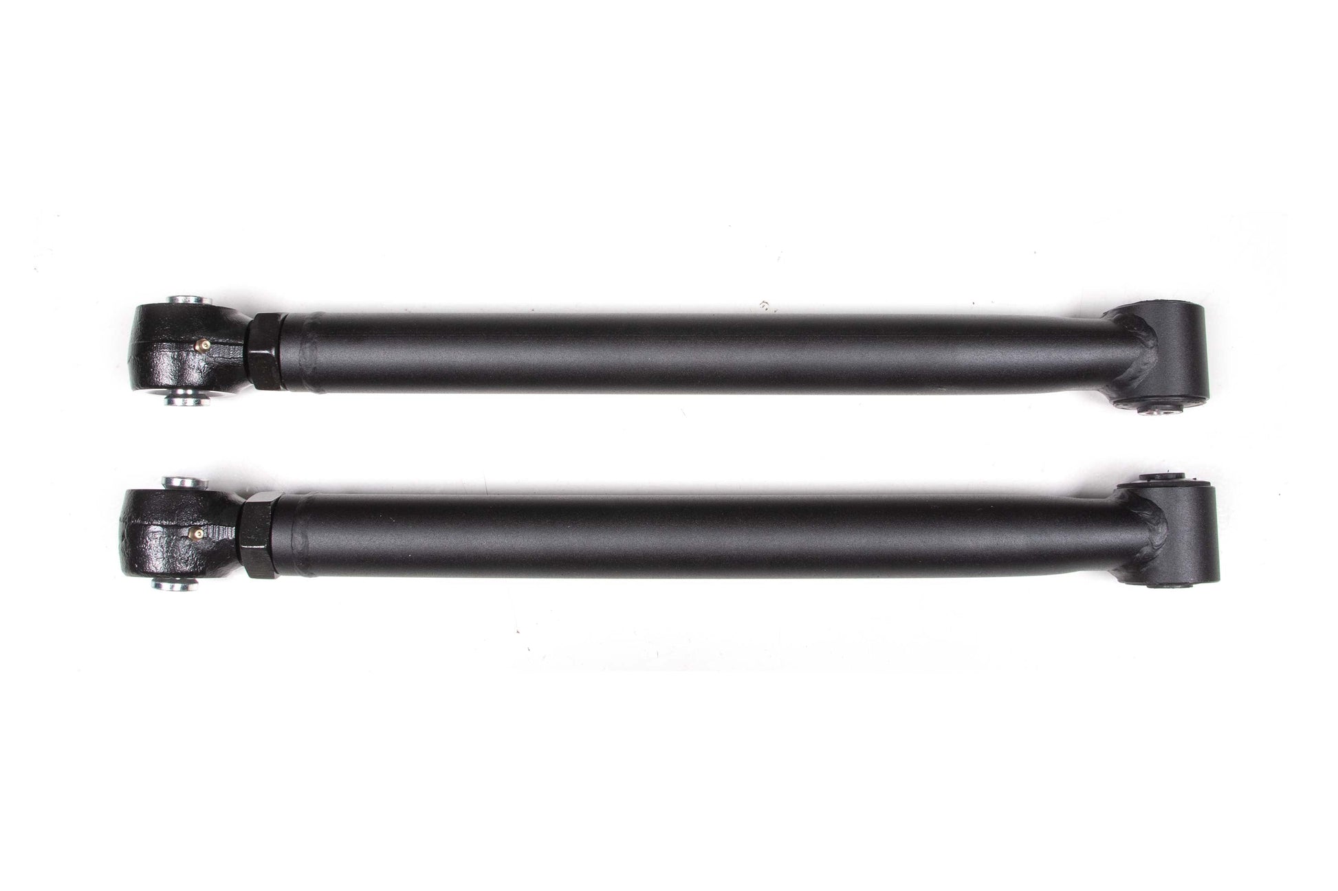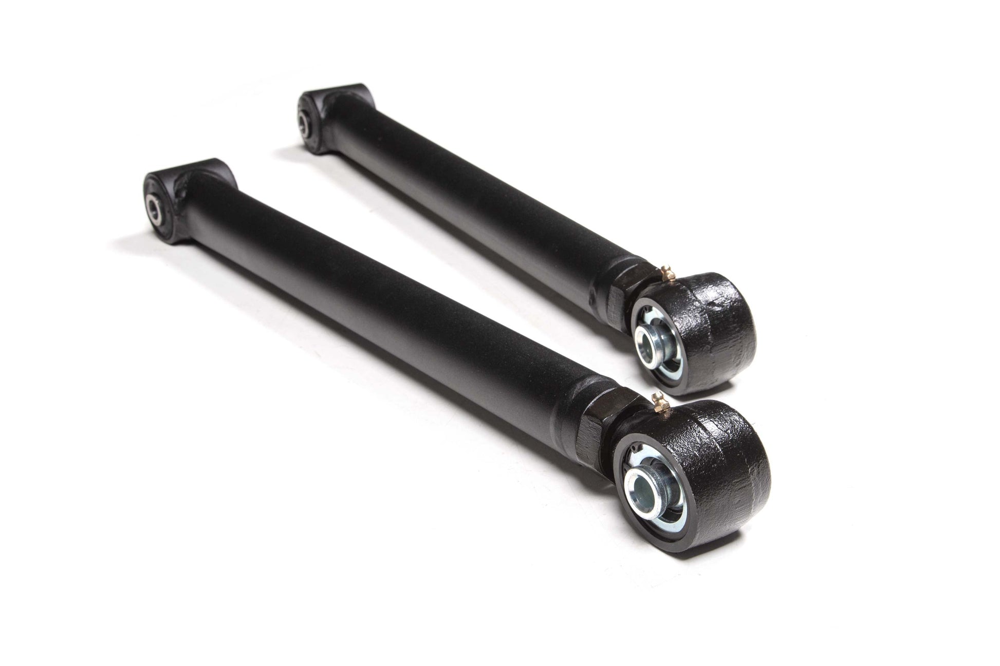 At the axle end they utilize an OE-style rubber bushing for long service-free operation and better isolation of noise, vibration, and harshness (NVH). At the frame mount they feature a large, forged flex end for strength, durability, and off-road articulation. The forged flex ends allow length adjustments to correctly position the rear axle and correct caster. Capable of 15-degrees of misalignment in either direction for more flex out on the trail.